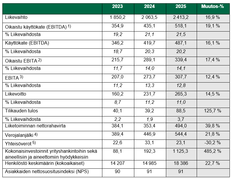 Mehiläinen-konsernin oikaistu EBITA 2) oli 339,4 (289,1) miljoonaa euroa, ja tilikauden tulos 88,5 (39,2) miljoonaa euroa, mikä on noin 3,7 prosenttia liikevaihdosta. Mehiläinen teki vuoden aikana merkittäviä panostuksia palveluverkoston laajentamiseen. Terveyspalveluissa Mehiläinen kasvoi Suomessa, Virossa, Ruotsissa, Liettuassa ja Saksassa muun muassa gynekologian, terapiapalveluiden, suun terveyden ja ortopedian saralla. Suomessa kotiin vietävät palvelut ja ikääntyneiden asumispalvelut kasvoivat sekä orgaanisesti että yritysostojen kautta. Investoinnit toimitiloihin, digitaaliseen kehitykseen, lääkinnällisiin laitteisiin ja muuhun kiinteään omaisuuteen kasvoivat noin 53,0 prosenttia edellisvuodesta 106,8 (69,8) miljoonaan euroon. Investointien kokonaismäärä, yritysostot mukaan lukien, nousi vuoden 2025 aikana 1 125,3 (192,3) miljoonaan euroon. Konsernin verojalanjälki nousi vuoden aikana 544,4 (446,9) miljoonaan euroon. Tilikauden verotettavaan tuloon perustuvat yhteisöverot olivat puolestaan 23,1 (33,1) miljoonaa euroa.