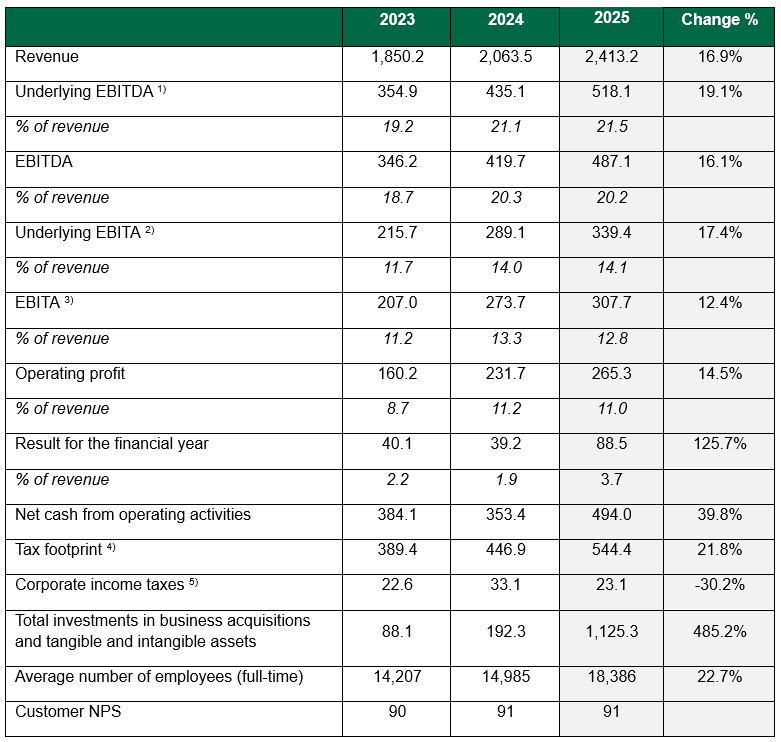 Mehiläinen’s revenue for 2025 increased by 16.9% from the previous year to EUR 2,413.2 (2,063.5) million. Growth was strong in all operating countries and across different business areas. In the first half of the year, Mehiläinen expanded into Lithuania with the acquisition of InMedica Group, and by the end of the year, acquisitions were concluded for healthcare companies Regina Maria in Romania and MediGroup in Serbia.