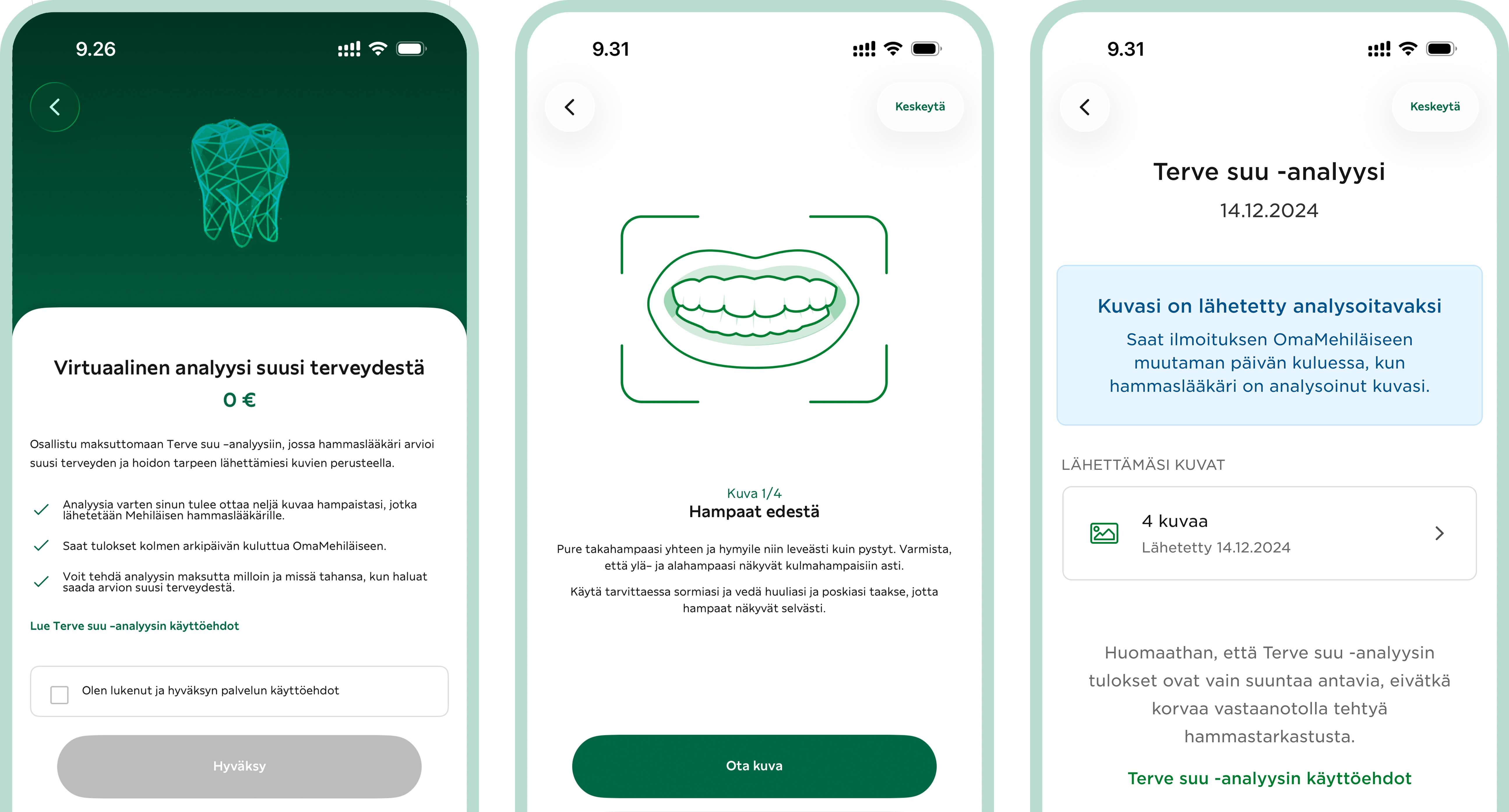 Haluako selvittää, miten suusi voi? Terve suu -analyysi on uusi virtuaalinen suun terveydentilan arvio. Hammaslääkärimme arvioi valokuvien perusteella suusi terveydentilaa – helposti ilman käyntiä vastaanotolla, vaikka kotisohvalta.
